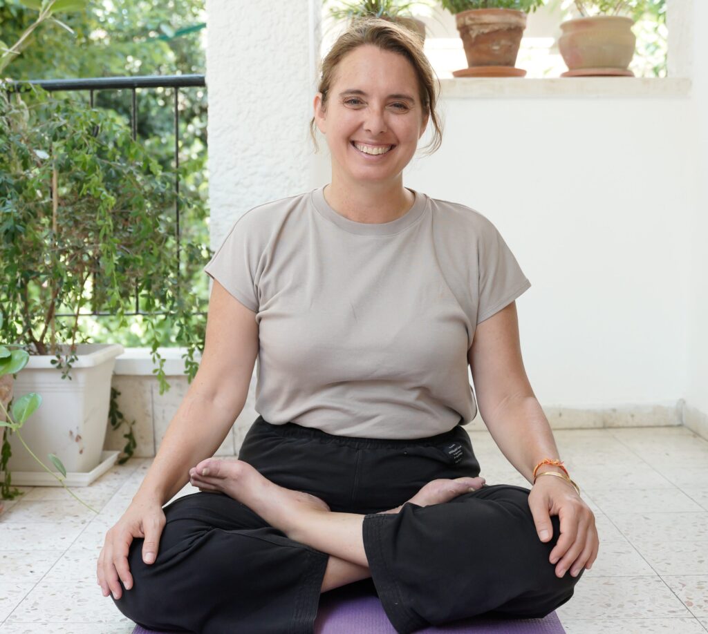 אני תלמידתה של אורית סן גופטה 26 שנה, והייתי אסיסטנטית של נגה ברקאי בקורסי מורים לויג'נאנה יוגה במכון וינגייט 8 שנים. אני מרגישה מבורכת לשבת לרגליהן ללמוד אומנות היוגה כדרך חיים. תרגמתי את ספרה של אורית מסעותיי בעקבות היוגה לאנגלית – חוויה שחזירה אותי להודו, נפאל וטיבט, שם פגשתי את תודעת היוגה במנזרים והרים קדושים. בשנים האחרונות אני טובלת את אצבעותיי באוקיינוס של הסנסקריט כדרך לצלול עומק יותר אל הפילוסופיה היוגית. אני רוקדת מילדות ועשיתי יוגה עם אבא שלי כילדה קטנה בסלון שלנו בניו יורק. אימון אס